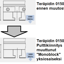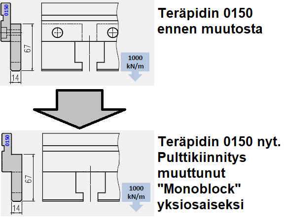 Teräpitimen aiempi pulttikiinnitys on muuttunut “Monoblock” yksiosaiseksi.
